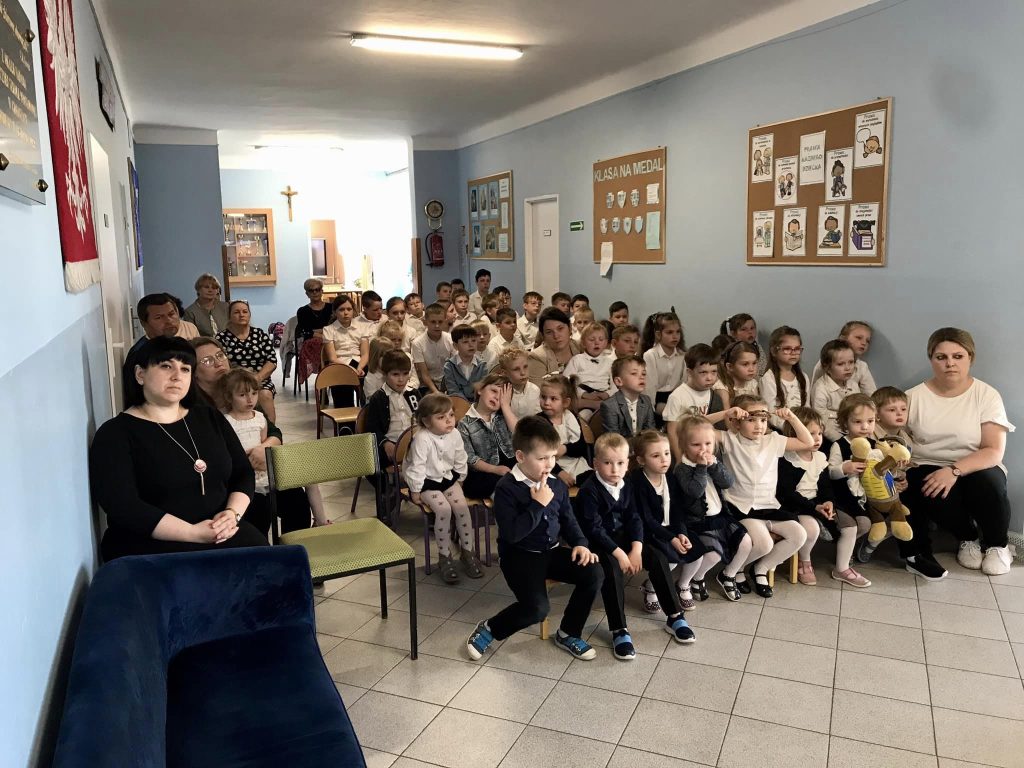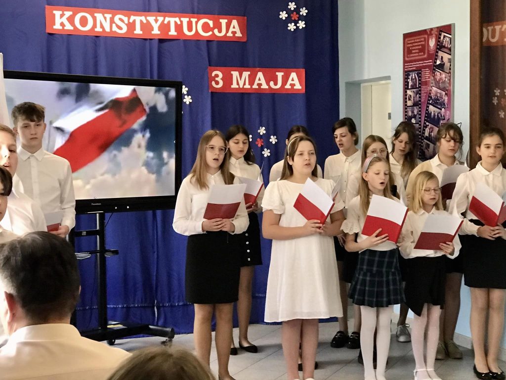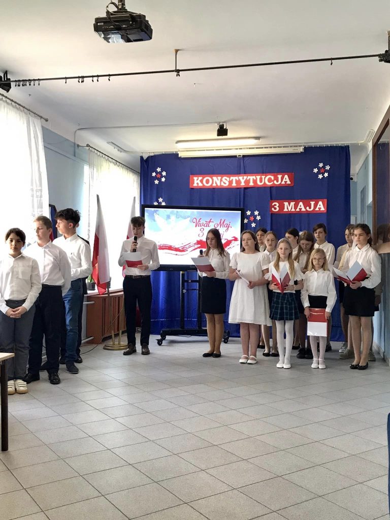 Jak co roku w naszej szkole świętowaliśmy zbliżającą się rocznicę uchwalenia Konstytucji 3 Maja. Uroczysty apel rozpoczęliśmy od podniosłego wydarzenia, wciągnięcia flagi państwowej na masz i odśpiewania hymnu Polski w obecności całej społeczności szkolnej pod kierunkiem p. Genowefy Czarneckiej. Uczniowie klasy IV – VIII słowem i pieśnią przybliżyli wydarzenia związane z uchwaleniem Ustawy Rządowej. Przedstawili historię obrad Sejmu Wielkiego, który opracował projekt konstytucji przyjętej przez Sejm 3 maja 1791 r. Uroczystość przybliżyła dzieciom i młodzieży wydarzenia historyczne i okoliczności powstania Konstytucji 3 Maja – pierwszej w Europie i drugiej na świecie. Podczas apelu została wyświetlona prezentacja multimedialna pt. ,, Witaj maj, trzeci maj!”, która pokazywała twórców konstytucji, dokument Ustawy Rządowej z 1791r. i polskie symbole narodowe. Z całą pewnością była to niezwykła lekcja historii, która przybliżyła istotne wydarzenia, ale także wpłynęła na kształtowanie patriotyzmu i poczucia dumy z faktu, że jesteśmy Polakami. Pani dyrektor Agnieszka Sikorska podziękowała za zorganizowanie akademii uczniom oraz nauczycielom p. Emilianowi Matysiakowi oraz p. Katarzynie Jankowskiej.